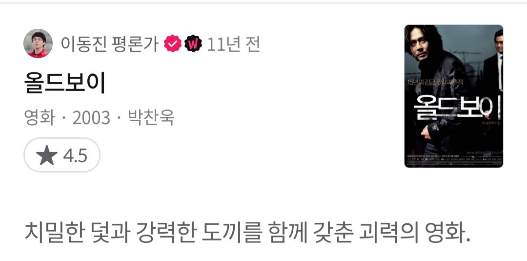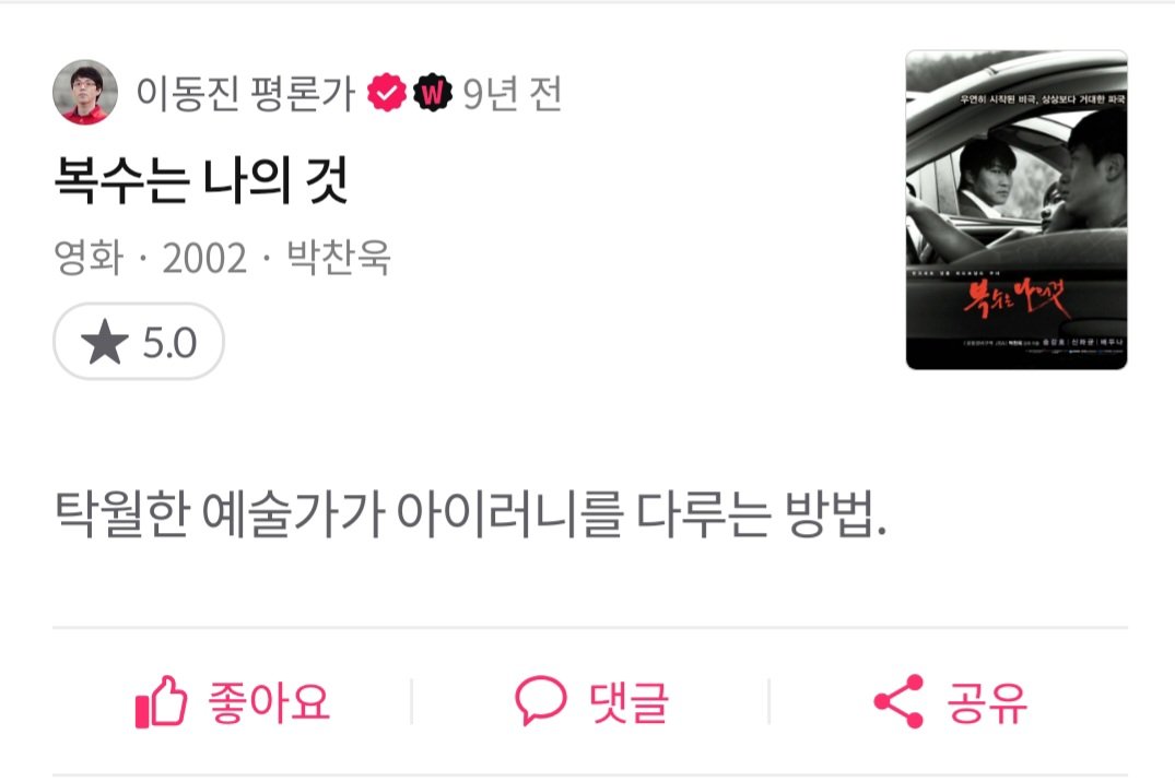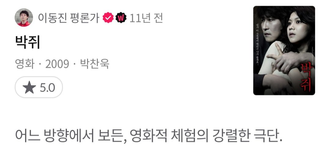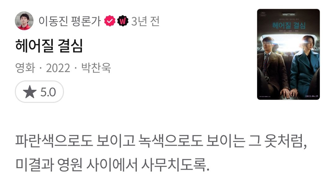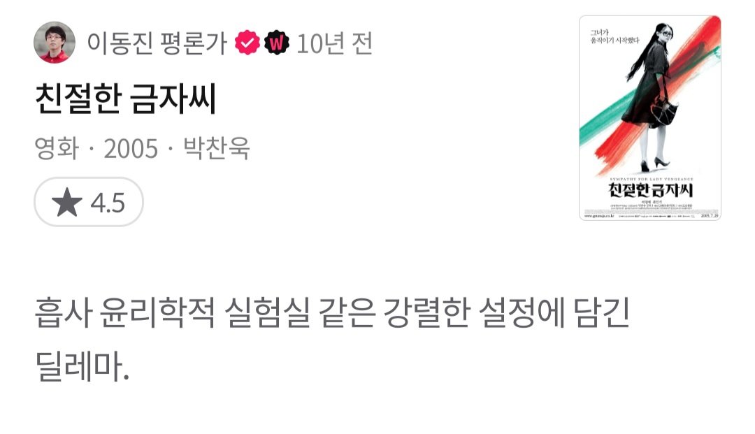 이동진 평론가의 박찬욱 감독 영화들 별점 및 한줄평