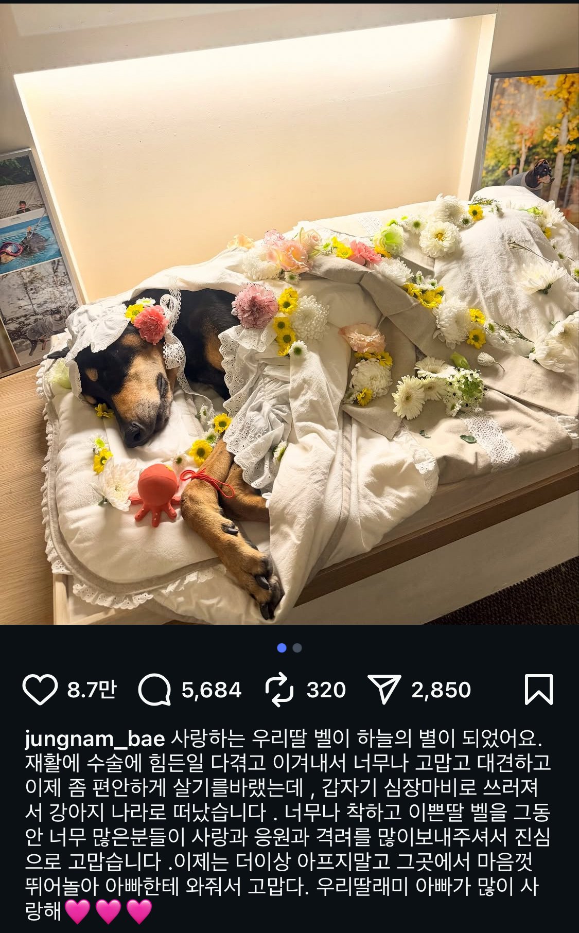 전신마비 극복했던 배정남 반려견 소식