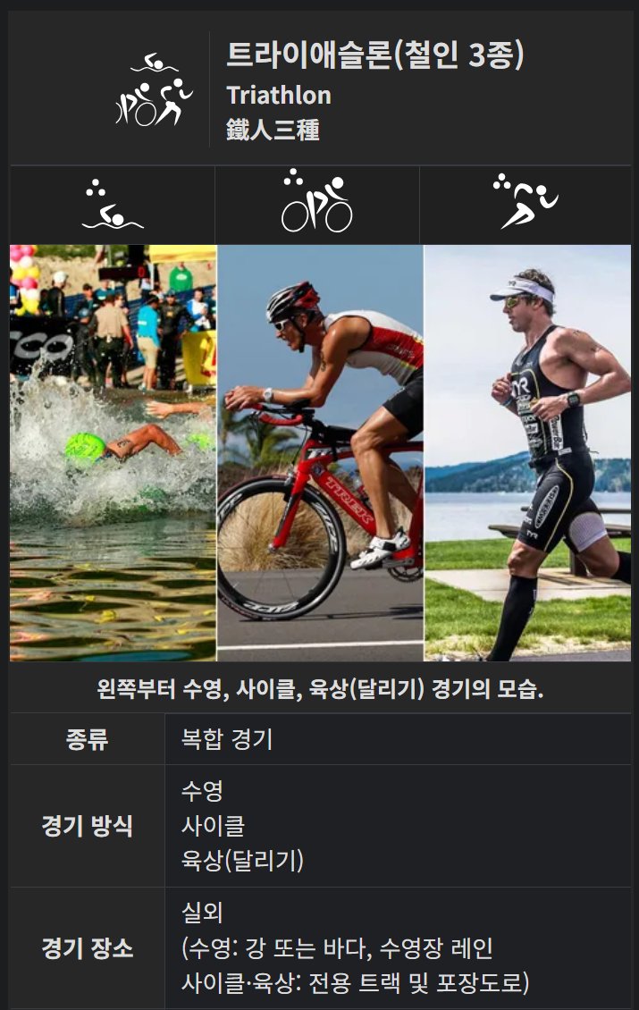 일단 철인 3종은 위 3가지 종목을 한번에 이어서 하는걸 말하고