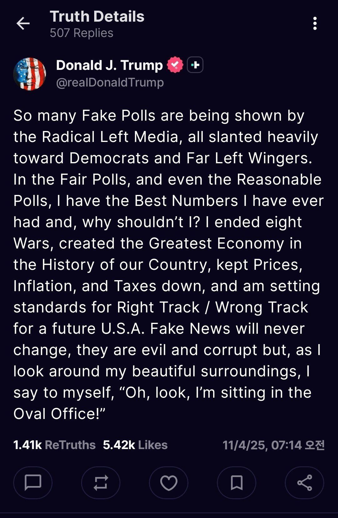 "너무나 많은 가짜 여론조사들이 급진 좌파 매체들에 의해 발표되고 있는데, 모두 민주당과 극좌 성향에게 매우 치우쳐 있습니다. 공정한 여론조사와 심지어 합리적인 여론조사에서도 나는 지금까지 내가 가져본 최고의 지지율을 기록하고 있습니다. 왜 아니겠습니까? 나는 8개의 전쟁을 끝냈고, 우리나라 역사상 최고의 경제를 만들었으며, 물가, 인플레이션, 세금을 낮게 유지했고, 앞으로의 미국이 나아갈 올바른 길과 잘못된 길의 기준을 세우고 있습니다. 가짜 뉴스는 절대 변하지 않으며, 그들은 악하고 부패했지만, 나는 내 아름다운 주변을 바라보며 '아, 나는 지금 백악관 집무실에 앉아 있구나!' 라고 스스로에게 말합니다."
