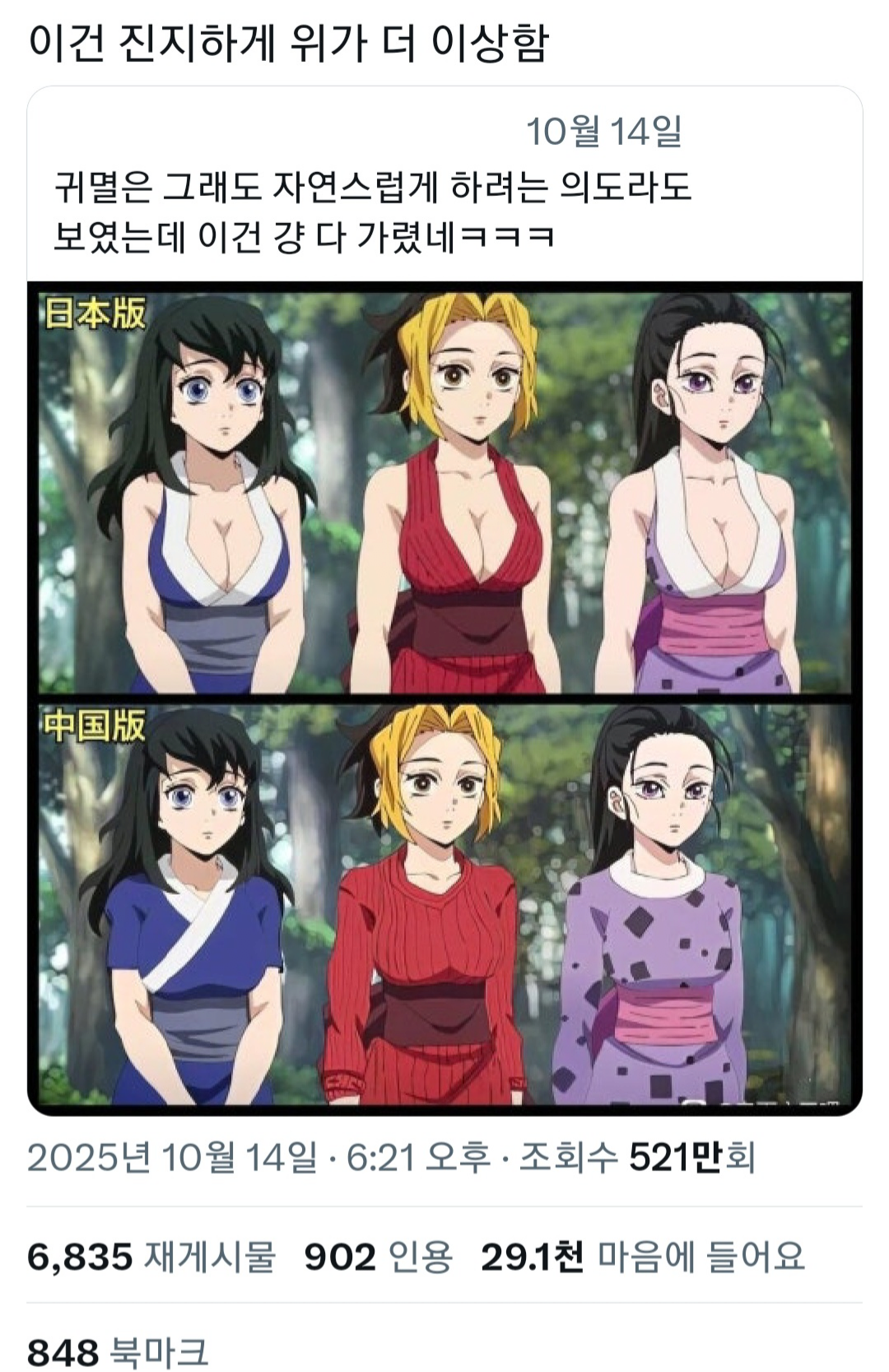 여초의 귀멸의 칼날 여캐 노출 검열 논란 ㄷㄷ