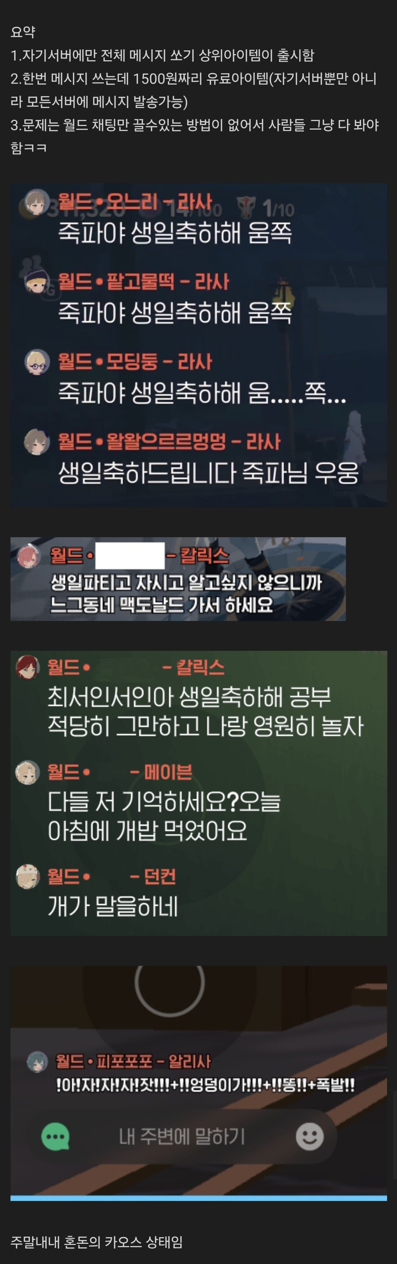 끌수 없는 유료 전체 메세지가 도입된 모바일 게임