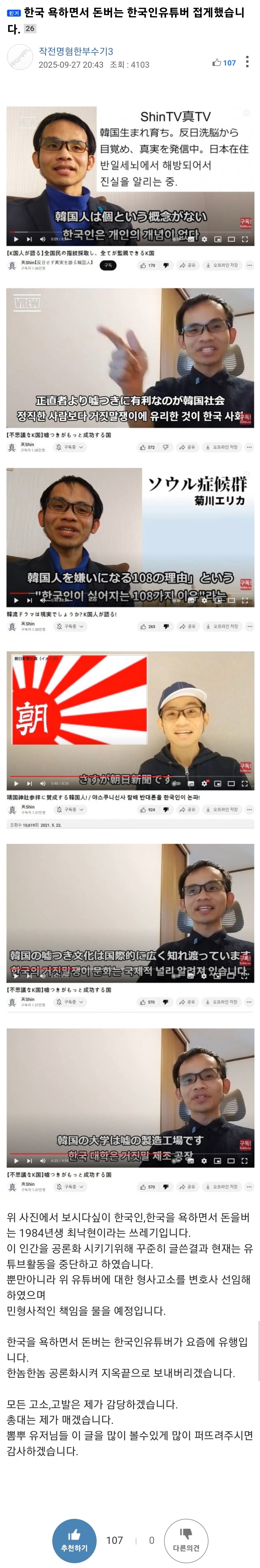 한국 욕하면서 돈버는 유튜버를 접게 했습니다