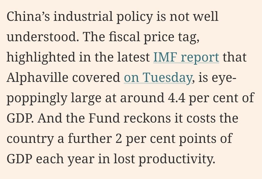 파이낸셜 타임스에 따르면 중국은 GDP의 4.4% 그러니까 연간 1200조원의 인류 역사상 최대규모 산업 정책 손실을 감수함에도 산업 보조금을 통한 세계 산업 독점을 지원중임.
