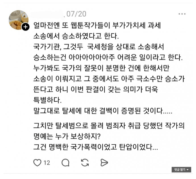 업계피셜로 야옹이 작가가 국세청 상대로 조세불복 승소해서 가산세를 돌려받는다고 하네요.