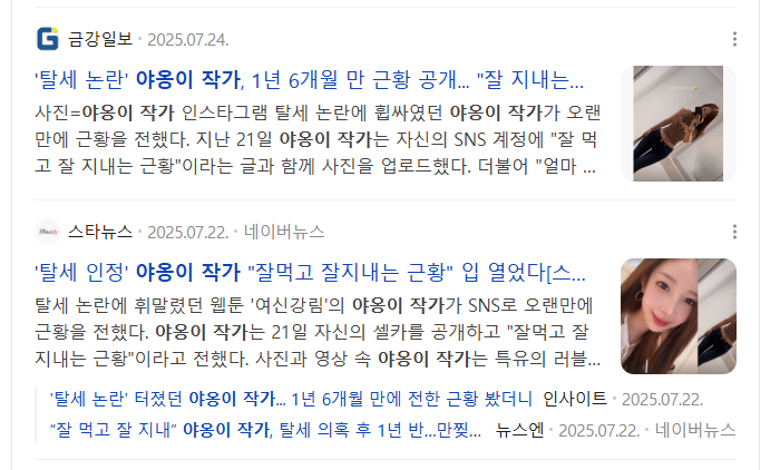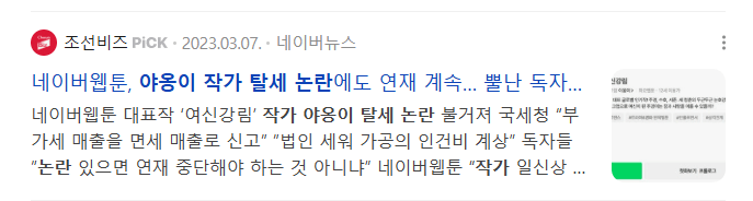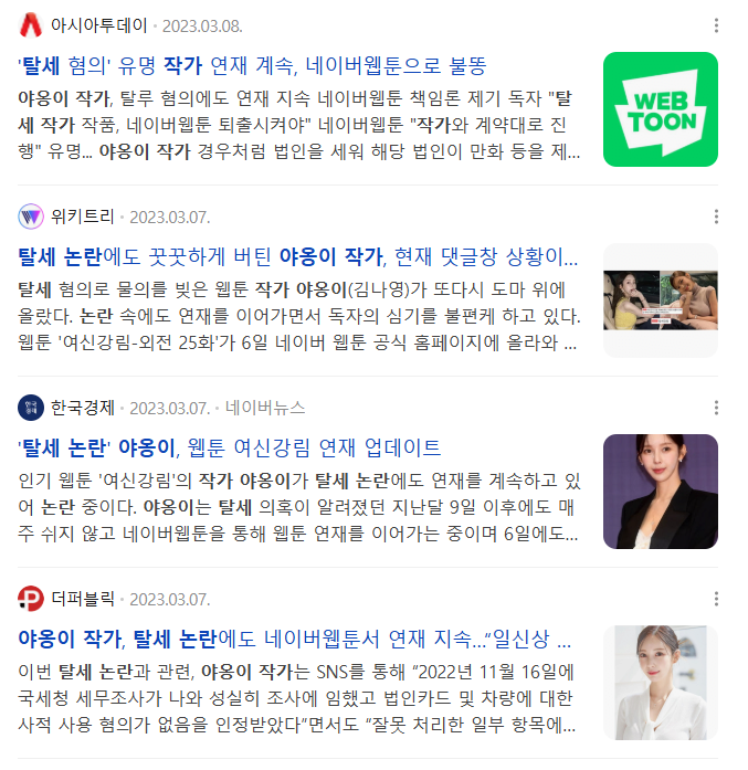 당시 연재중이던 여신강림 댓글창에는 탈세범 또는 연재중단하라는 댓글로 엉망진창 되었던 기억이 있습니다