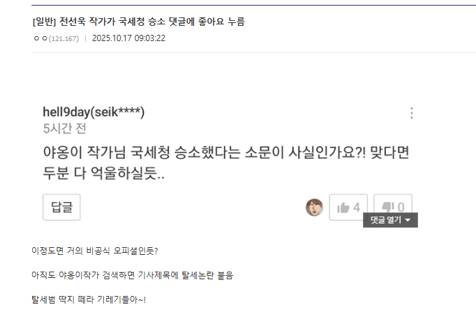그 이후 오늘, 전선욱 작가 웹툰에 국세청 승소 관련 댓글을 썼는데