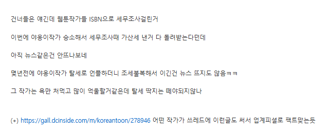 업계에서는 야옹이 작가 포함 웹툰작가들이 조세불복 이긴건 이미 다 알려져있다고 합니다.