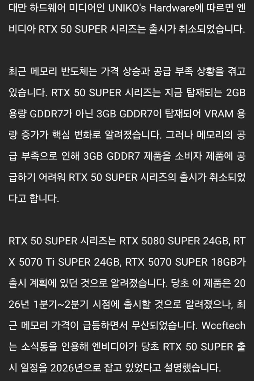 메모리 부족으로 인해 RTX 50 SUPER 취소