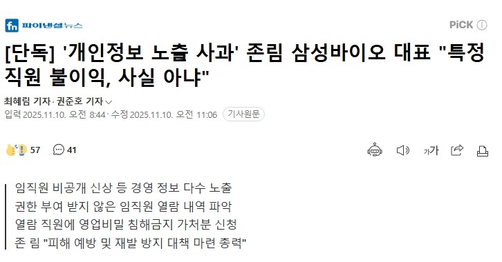 삼성 개인정보/인사문건 유출 사건 관련 사과문